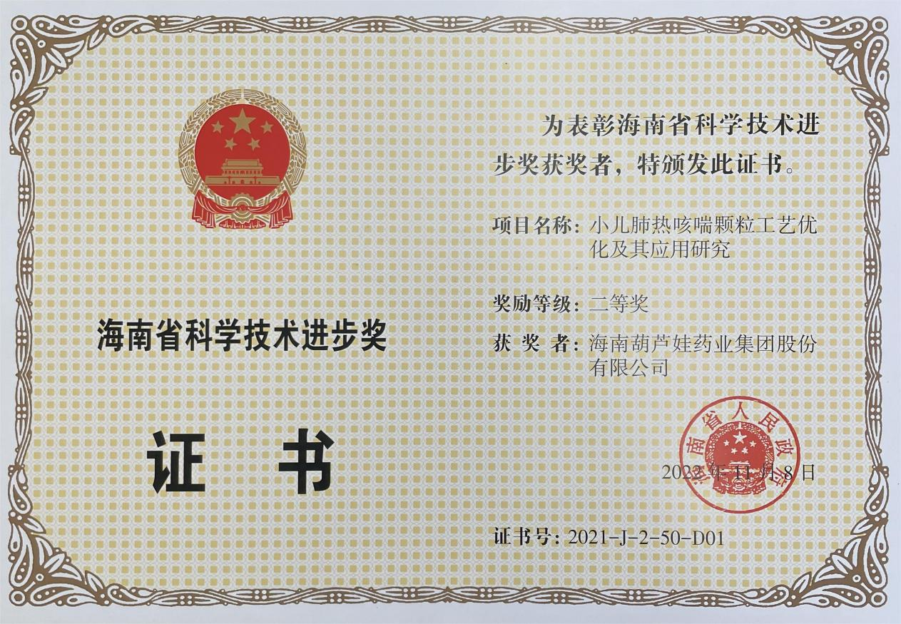 为此,小儿肺热咳喘颗粒的制备方法获得了第二十一届中国专利优秀奖(2019年),专利申请号:ZL201010134951,此次作为专利技术的应用,获得了2021年度海南省科学技术进步奖二等奖。在此之前,万博牌小儿肺热咳喘颗粒还多次被授予“临床价值中成药品牌”、“中国连锁药店最具合作价值单品”,荣登“中国医药品牌榜”。